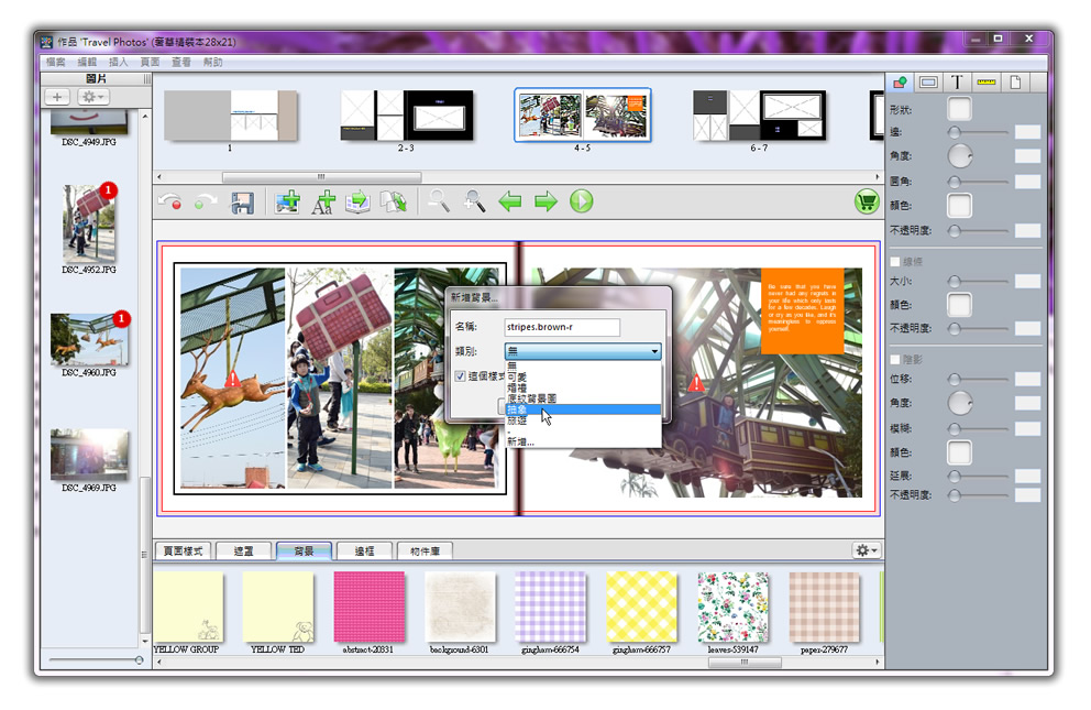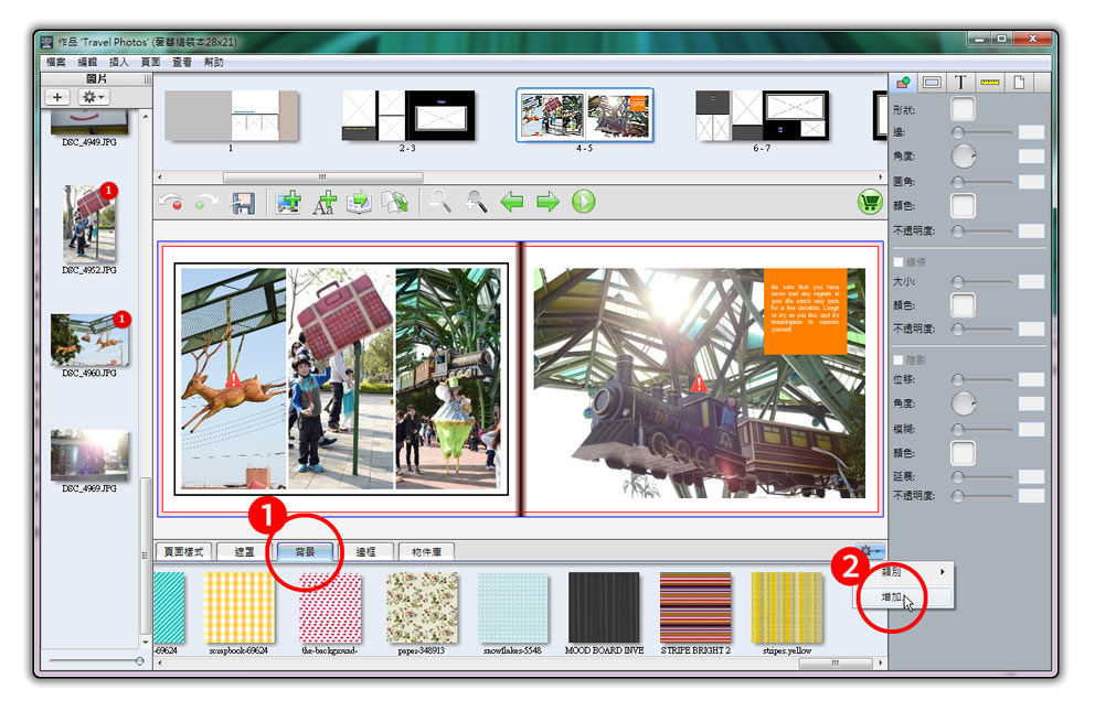 解壓縮完成後後,開啟Photobook Designer作品於下方視窗選擇背景,點選右方齒輪圖示選擇增加。