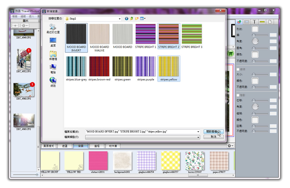 選擇背景圖資料夾。點選想加入的背景圖 (可按住 Ctrl 複選 或 Ctrl+A 全選),完成後按下開啟舊檔。跳出新增視窗可自己分類方便尋找,完成後按下確定。