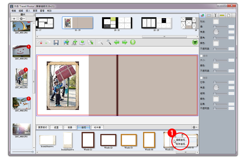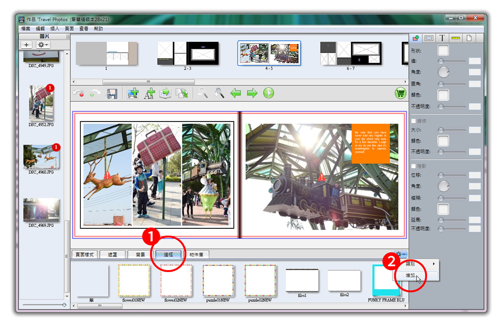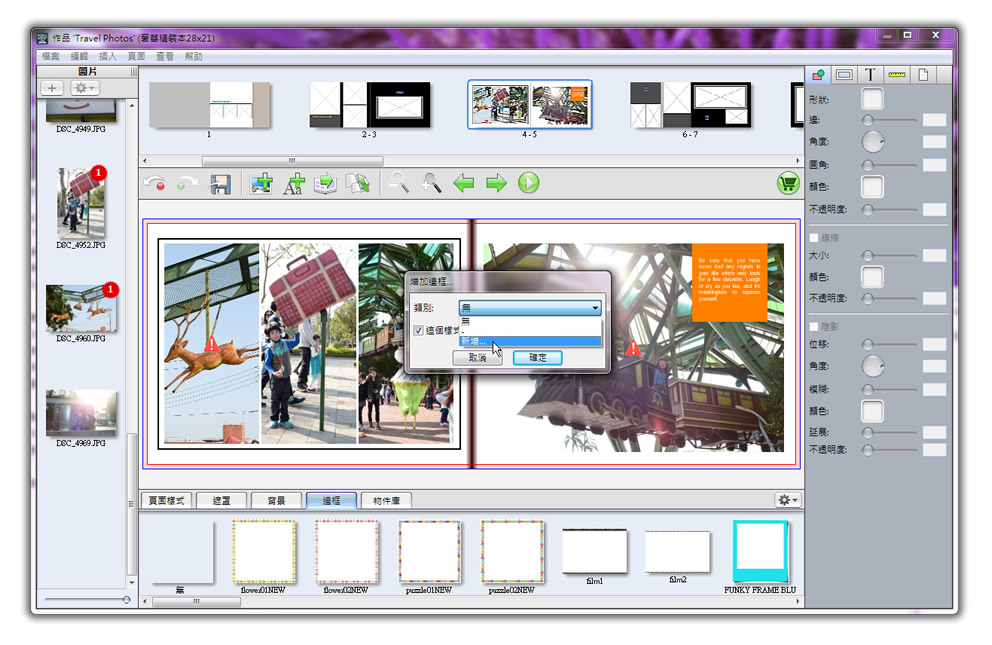 下載檔案解壓縮完成後,開啟PhotobookDesigner作品於下方視窗選擇邊框,點選右方齒輪圖示選擇增加。