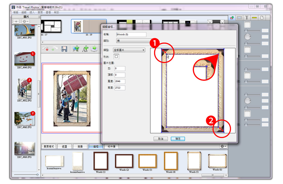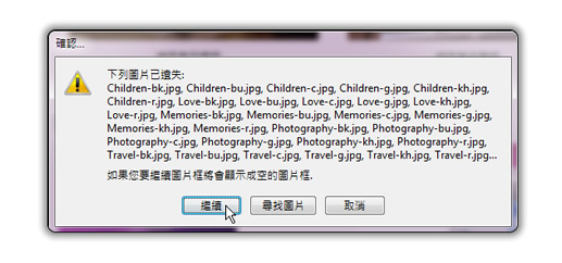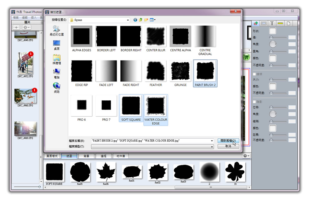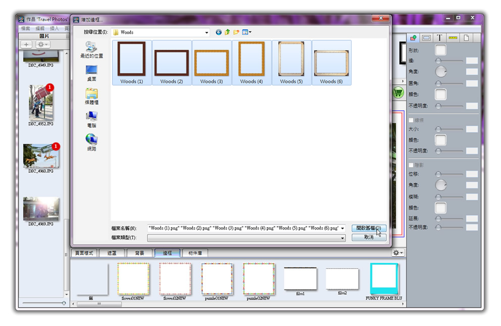 選擇邊框圖資料夾。點選想加入的邊框(可按住Ctrl複選或Ctrl+A全選),完成後按下開啟舊檔。跳出新增視窗可自己分類方便尋找,完成後按下確定。