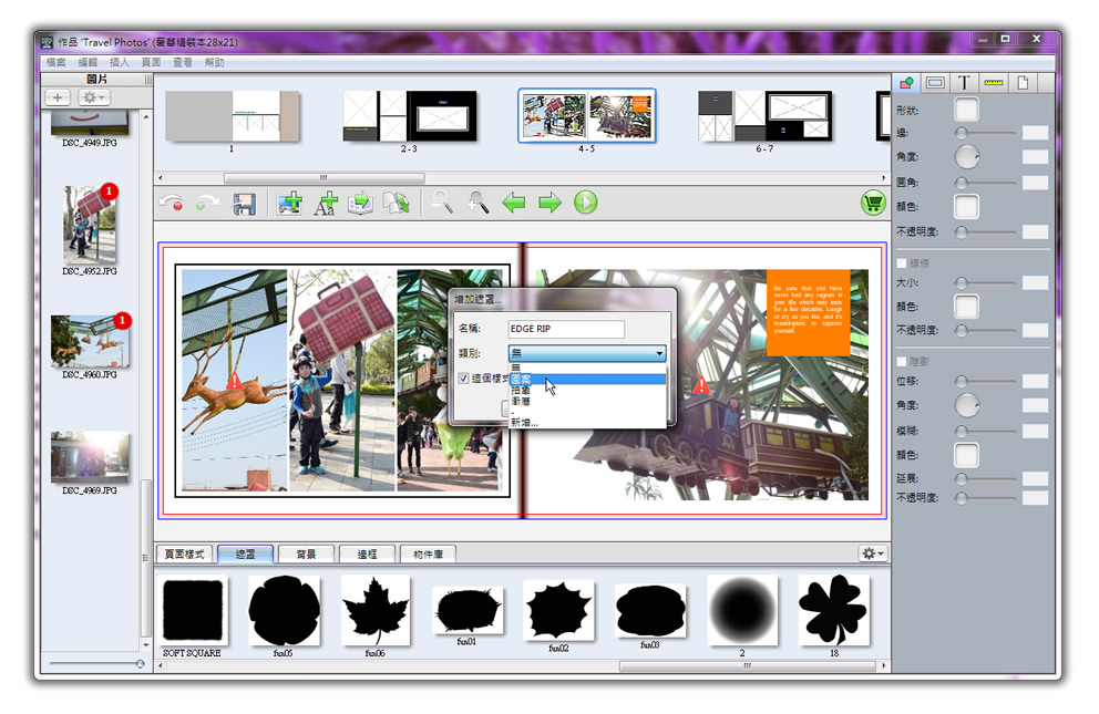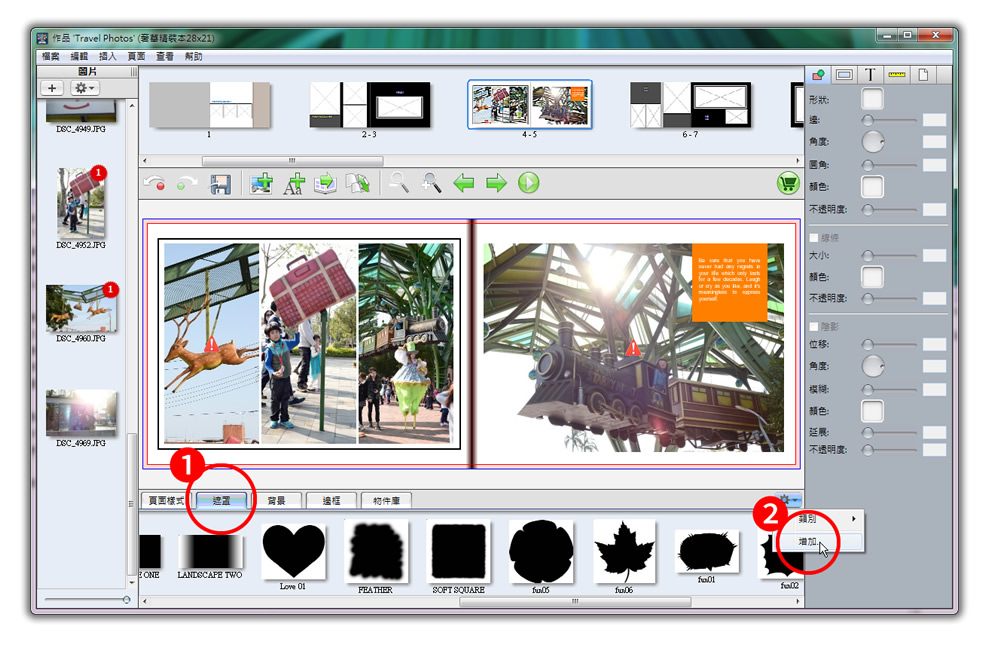 下載檔案解壓縮完成後,開啟PhotobookDesigner作品於下方視窗選擇遮罩,點選右方齒輪圖示選擇增加。