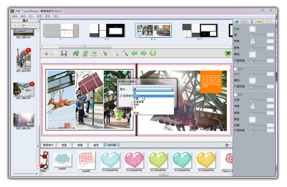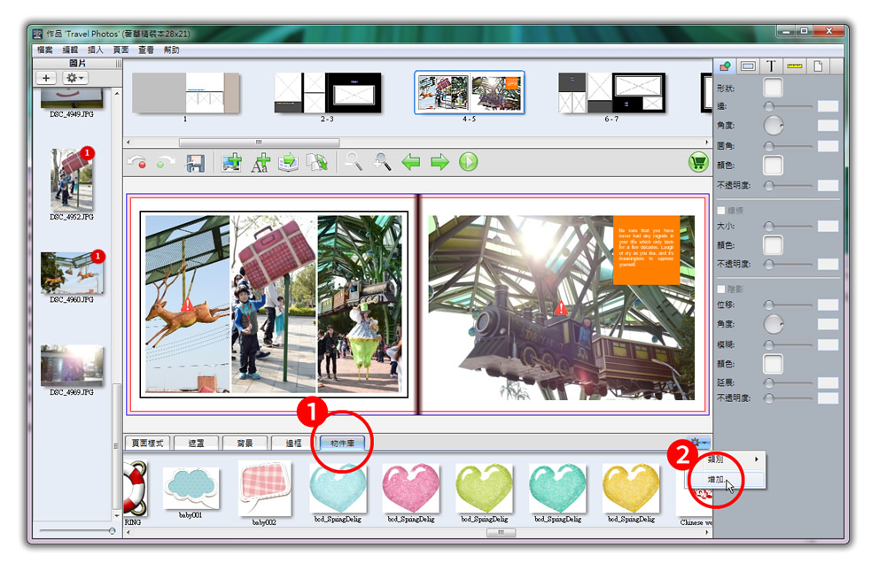 下載檔案解壓縮完成後,開啟PhotobookDesigner作品於下方視窗選擇物件庫,點選右方齒輪圖示選擇增加。