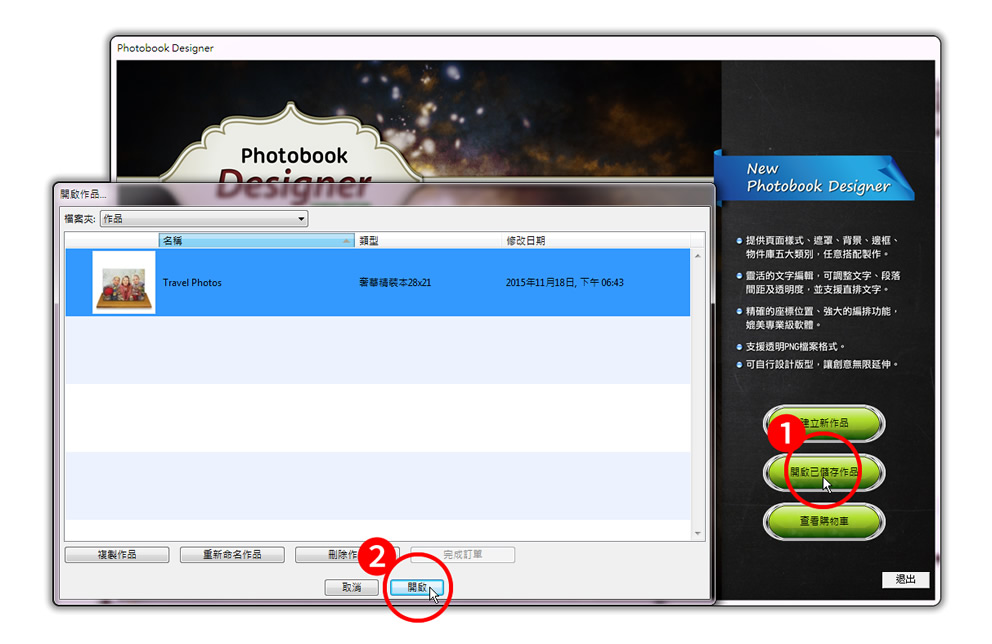 啟始畫面選擇 開啟已儲存作品,跳出視窗內即可看到下載的作品。如跳出遺失圖片可按下繼續,即可開始編排作品。(如視窗內沒有下載作品請確認Photobook Designer Projects資料夾內作品是否有重複的資料夾)